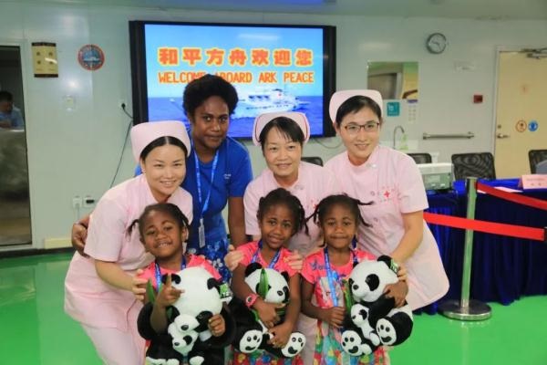 Tiga adik-beradik menerima cenderahati daripada petugas perubatan di Hospital Peace Ark di Vanuatu, sempena Hari Kanak-kanak negara itu pada 24 Julai 2018.