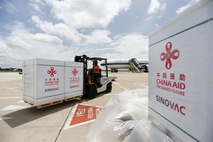 Vaksin COVID-19 sumbangan kerajaan China dihantar tiba di lapangan terbang Phnom Penh pada 14 Oktober 2021.