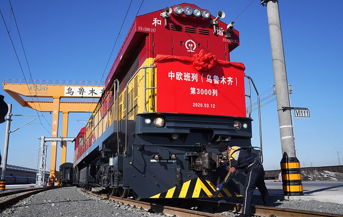 Kereta api kargo China-Eropah kelihatan berlepas ke Uzbekistan melalui Horgos, Xinjiang pada Mac 2020.