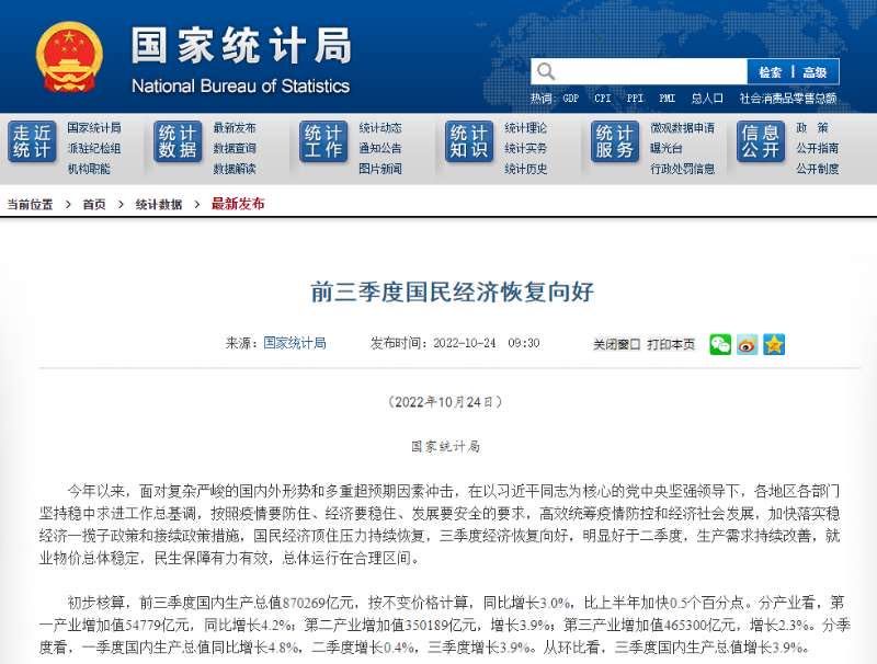 Keluaran Dalam Negara Kasar (KDNK) China mencapai RMB87.02 trilion (RM56.91 trilion) pada tiga suku pertama tahun ini, meningkat 3 peratus berbanding tempoh sama pada tahun lalu, dan 0.5 peratus lebih tinggi berbanding separuh tahun pertama tahun ini.
