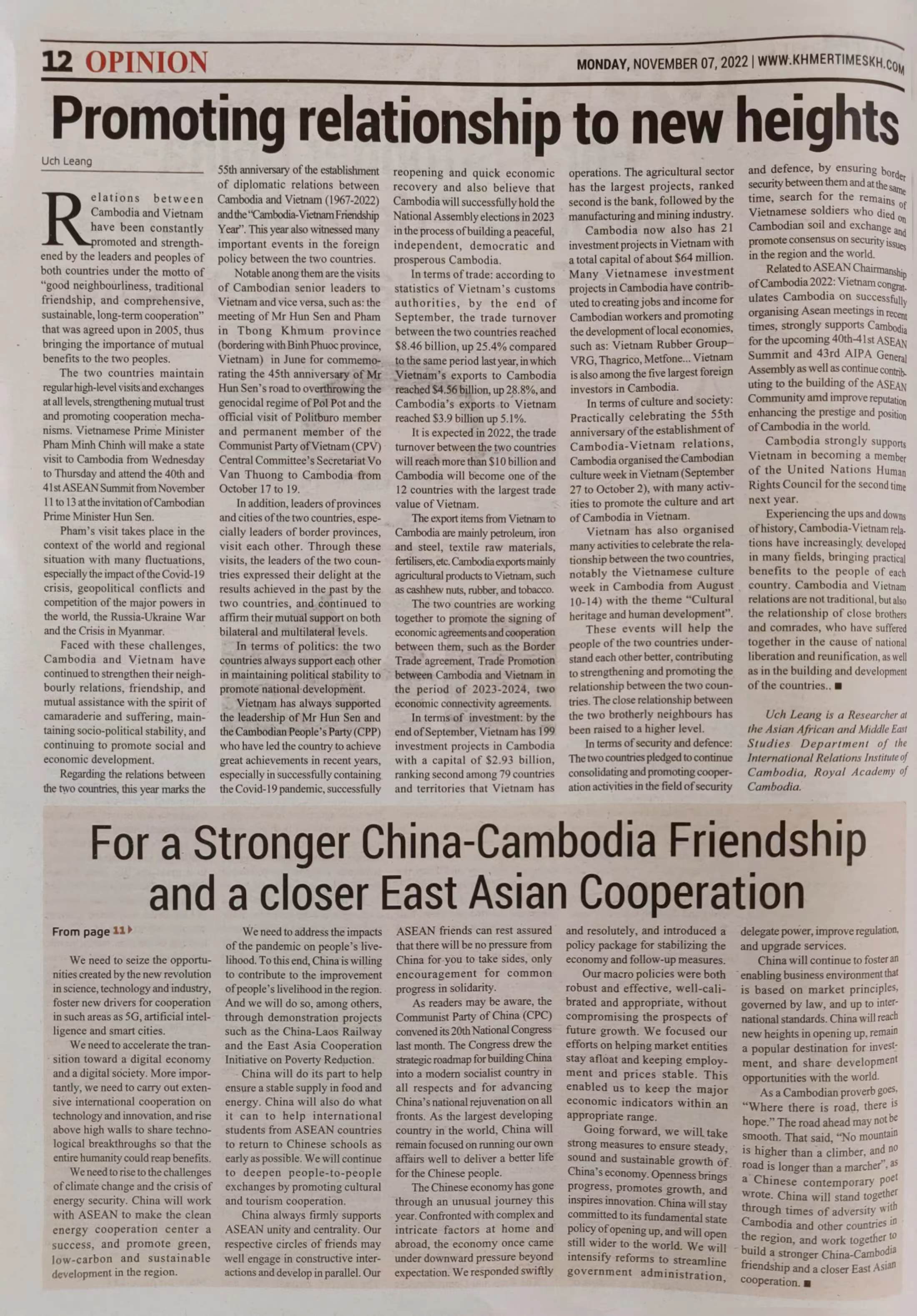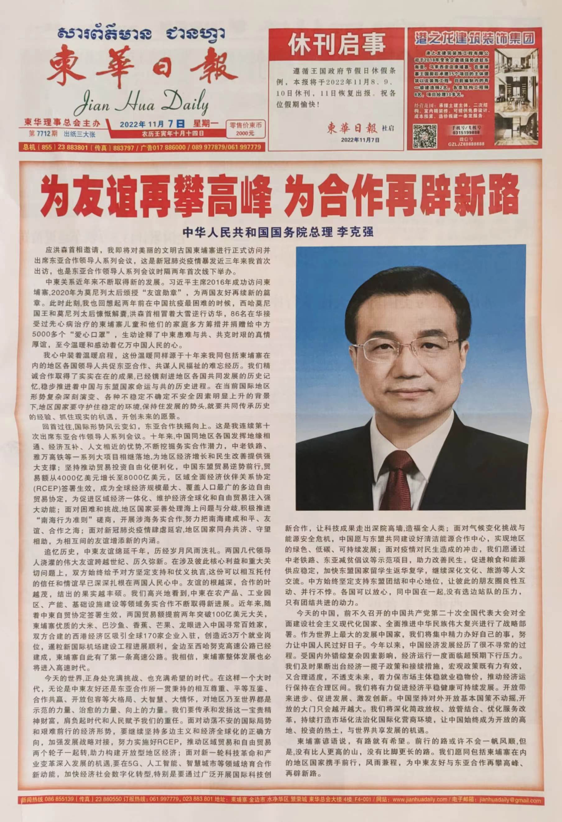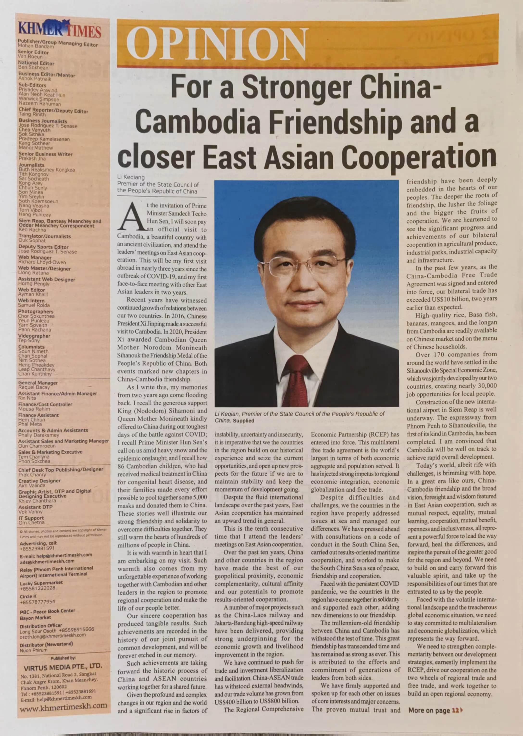 China bersedia berkembang bersama-sama dengan negara serantau termasuk Kemboja dan merintis jalan baharu untuk kerjasama bilateral, malah kerjasama Asia Timur. Demikian dinyatakan Perdana Menteri China, Li Keqiang dalam artikelnya yang disiarkan media perdana Kemboja dalam bahasa Kemboja, Inggeris dan China hari ini sebelum beliau bertolak untuk menghadiri siri mesyuarat pemimpin kerjasama Asia Timur dan melakukan lawatan rasmi di negara itu.