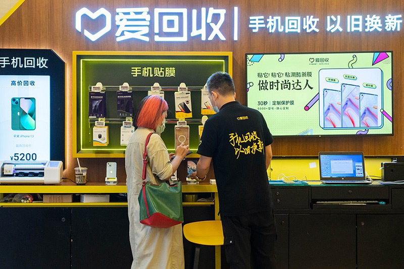 Seorang pengguna (kiri) membelek telefon bimbit terpakai di sebuah cawangan ATRenew di Shanghai pada bulan September (GAMBAR oleh FAN JIANLEI/CHINA DAILY)