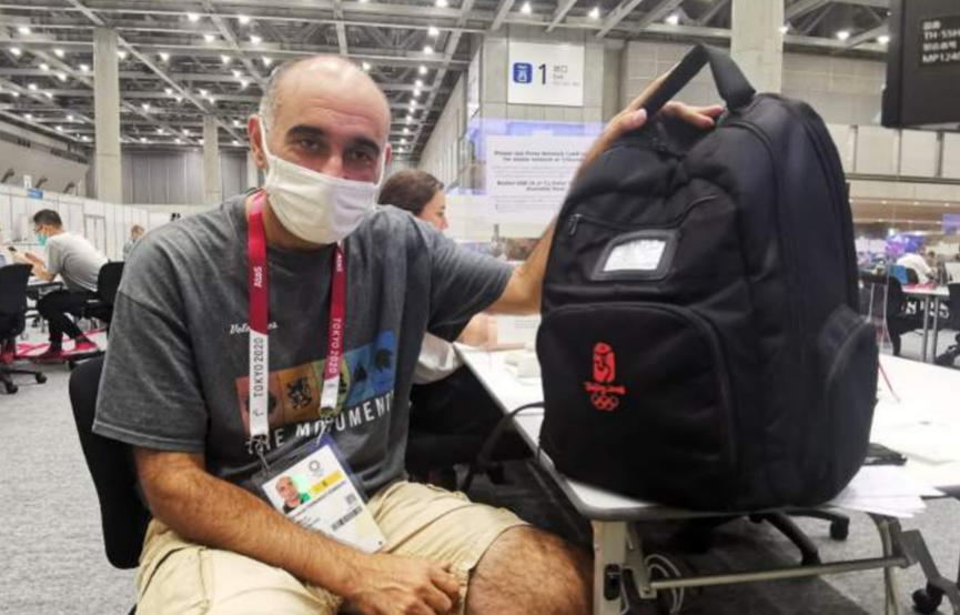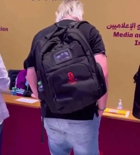Seorang wartawan asing dilihat menggalas beg memorabilia Sukan Olimpik Musim Panas 2008 semasa melakukan pendaftaran media di Piala Dunia Qatar 2022.