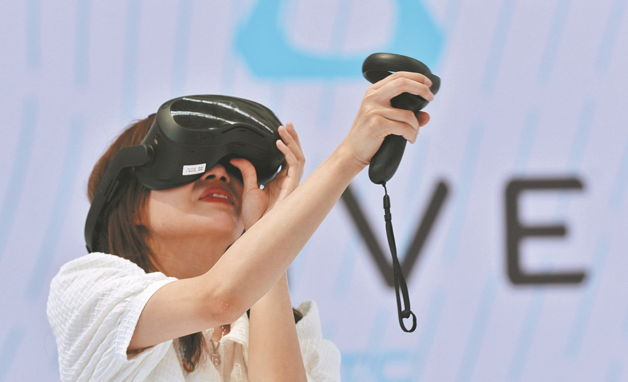 Seorang pengunjung bermain permainan VR di kawasan pameran HTC Corp semasa Konvensyen 5G Dunia 2022 di Harbin, provinsi Heilongjiang, pada bulan Ogos. (Foto: Zhang Shu/ China Daily)