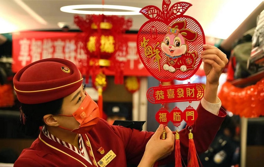 Sempena perayaan ini, kereta api laju antara Beijing dan Tianjin juga dilengkapi tanglung, guntingan kertas dan hiasan yang berwarna merah, sekali gus menambah suasana sambutan TBC.