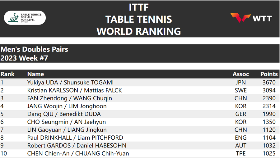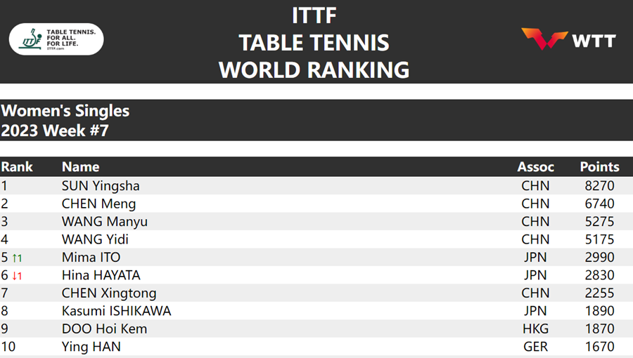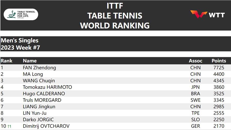 Selepas kemas kini dibuat, edisi ke-7 ranking ping pong dunia turut dikeluarkan, dengan pasukan China mendapat kedudukan teratas dalam 4 kategori.
