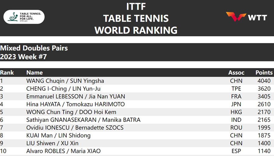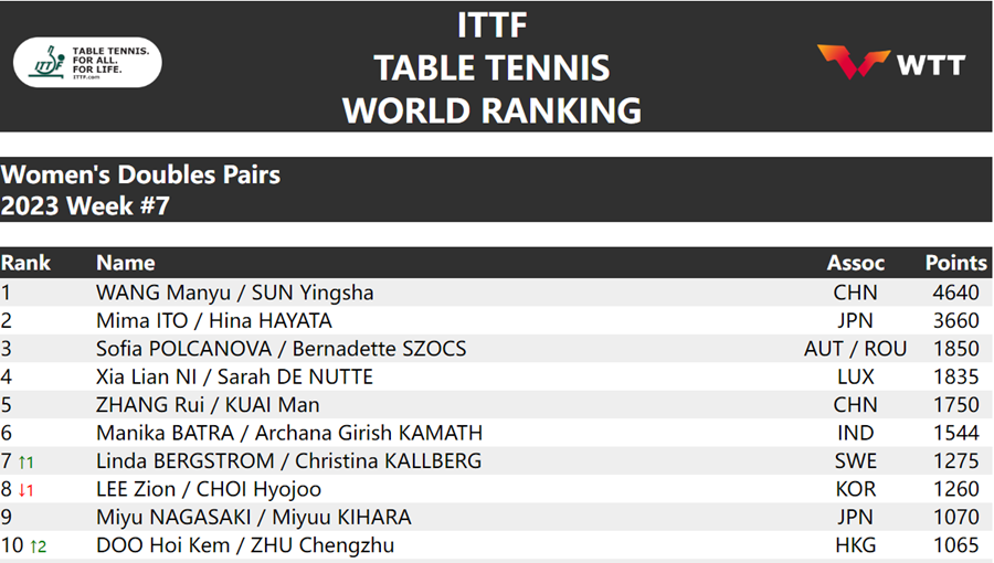 Dalam kategori beregu wanita, Wang Manyu/Sun Yingsha kekal di tempat teratas. Dalam kategori beregu campuran, Wang Chuqin/Sun Yingsha mengungguli senarai kedudukan.