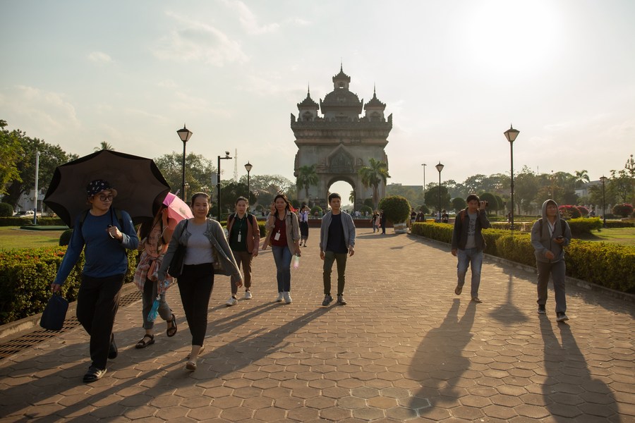 Pelancong melawat Taman Patuxay yang terletak di pusat bandar Vientiane, ibu kota Laos, pada 7 Februari 2023. (foto: Kaikeo Saiyasane/Xinhua)