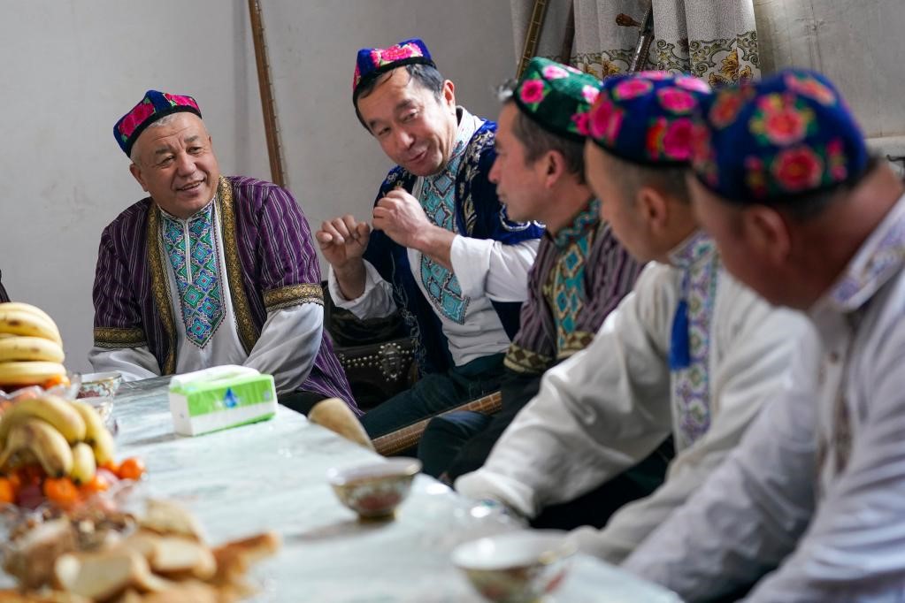 Pada 11 Januari lalu, artis Muqam, Mamat Yusup (tiga dari kiri) dan Sulayman Abdu (keempat dari kiri) membuat persembahan Muqam di majlis perkahwinan kampung. (Foto/Xinhua)