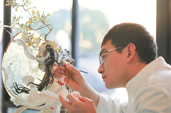 Zhou menambah penghalusan terakhir pada ciptaan fondantnya Chang'e, dewi bulan dalam mitos China. (foto: China Daily)