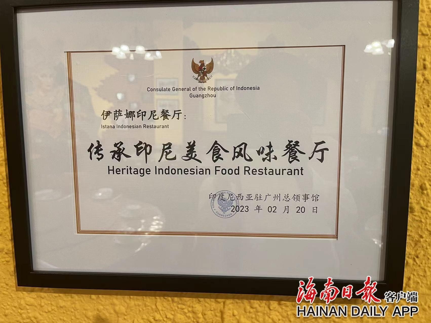 Konsulat Jeneral Republik Indonesia di Guangzhou menyampaikan plak ‘Restoran Warisan Sajian Indonesia’ kepada Restoran Indonesia ISTANA di Xinglong, Hainan. (Foto/Hainan Daily)