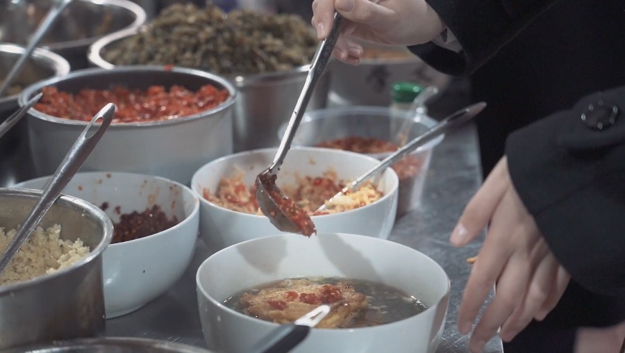 Pelanggan menambahkan sos cili ke dalam bihun. (Gambar oleh Yuan Meng/People’s Daily Online)