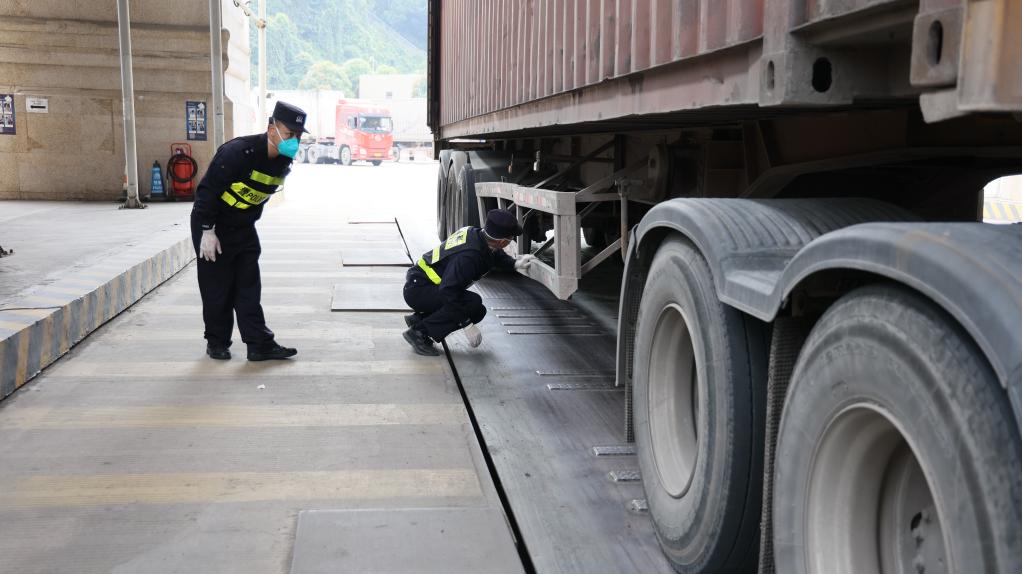 Pegawai imigresen memeriksa kenderaan di pintu sempadan Youyi. (Foto/Xinhua)
