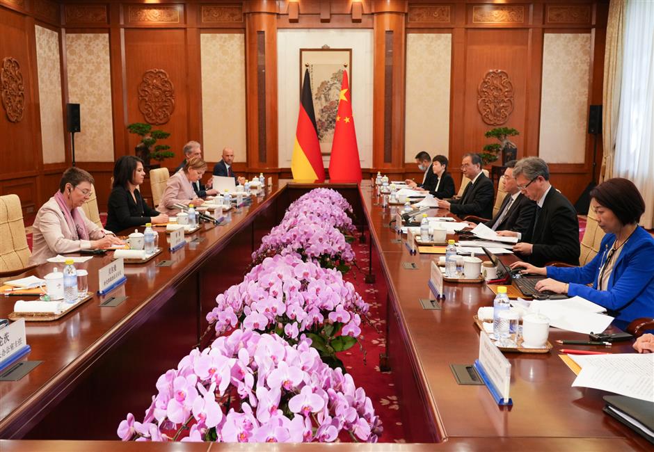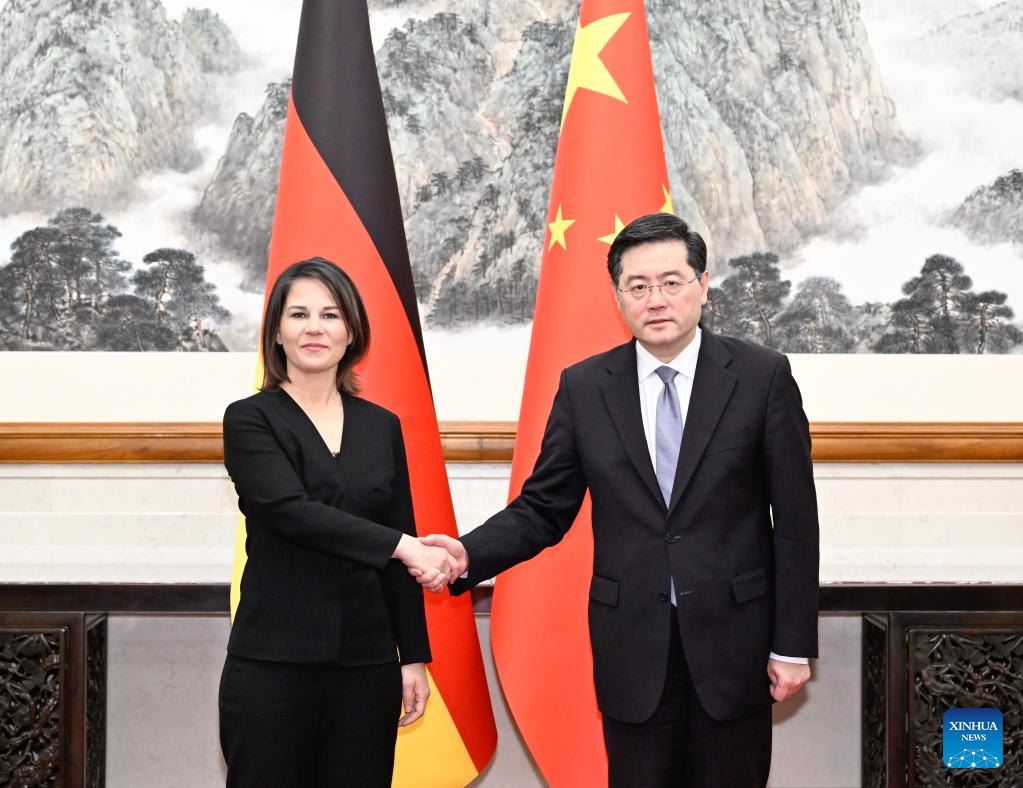 Ahli Dewan Negara China merangkap Menteri Luar, Qin Gang dan rakan sejawatnya dari Jerman, Annalena Baerbock mempengerusikan bersama dialog strategik China-Jerman mengenai diplomasi dan keselamatan pusingan keenam di Beijing pada 14 April.