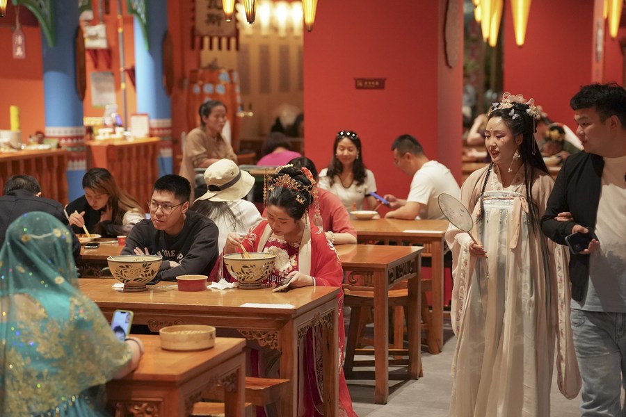 | Pelancong makan di sebuah jalan bertema di Xi’an, provinsi Shaanxi, barat laut China pada 11 Mei 2023. (Xinhua/Shao Rui) |