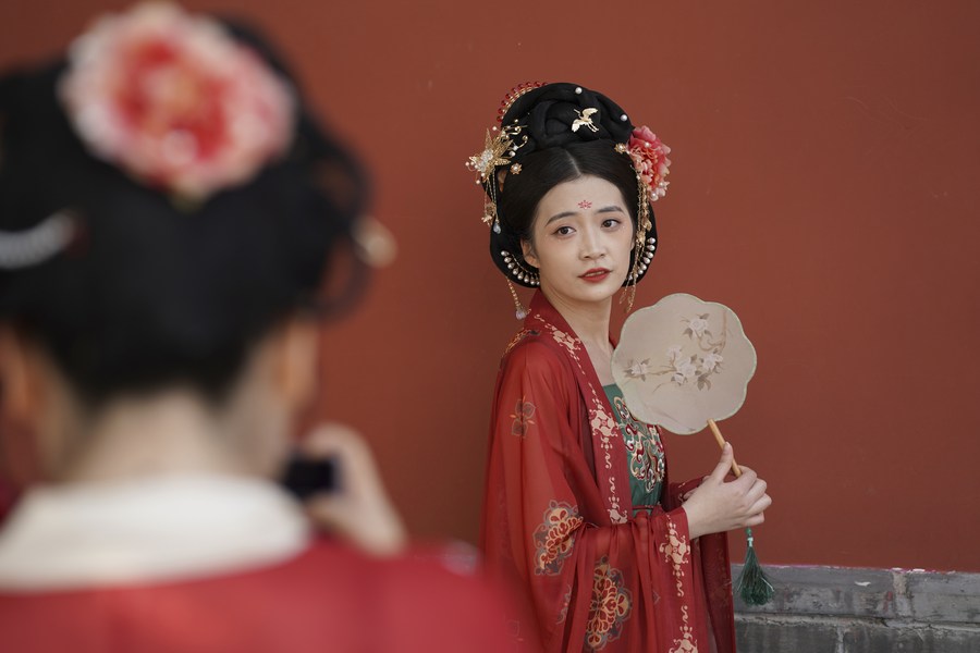 | Seorang pelancong bergaya untuk mengambil gambar di kawasan peranginan Pagoda Angsa Liar Besar di Xi’an, provinsi Shaanxi, barat laut China pada 25 Mac 2023. (Xinhua/Shao Rui) |