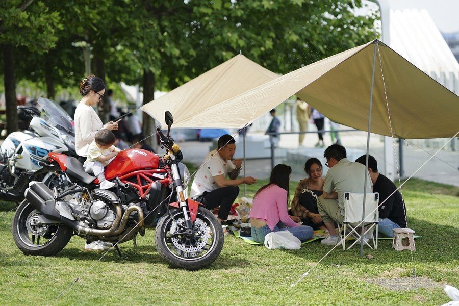| Orang ramai berkelah di sebuah taman di tebing Sungai Bahe di Xi’an, provinsi Shaanxi, barat laut China pada 15 Mei 2022. (Xinhua/Shao Rui) |