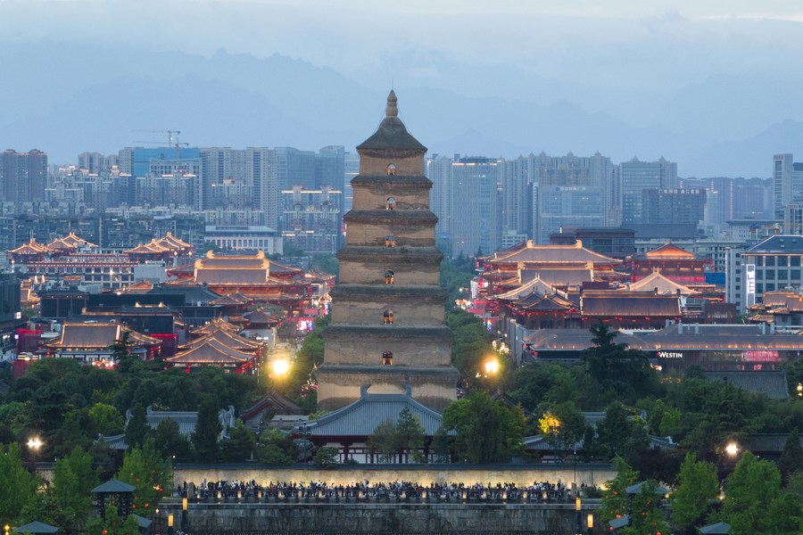 | Foto yang diambil pada 8 Mei 2023 ini menunjukkan pemandangan di Pagoda Angsa Liar Besar dan kawasan peranginan Datang Everbright City di Xi’an, provinsi Shaanxi, barat laut China. (Xinhua/Shao Rui) |