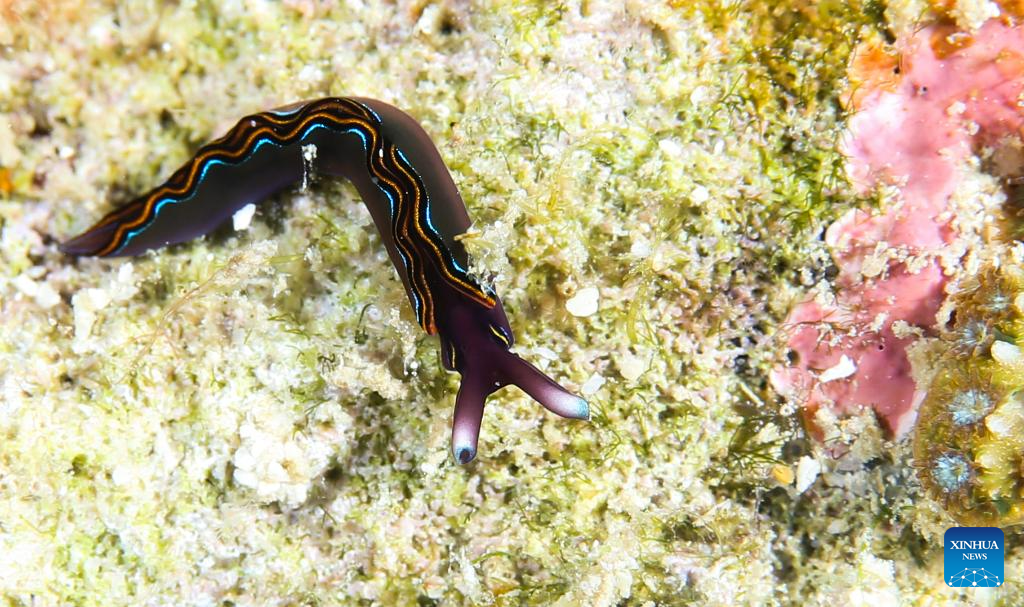 | Foto yang diambil pada 25 Mei 2021 ini menunjukkan seekor lintah laut di sebuah ladang ternak marin di perairan Pulau Wuzhizhou di Sanya, provinsi Hainan, selatan China. (Xinhua/Yang Guanyu) |