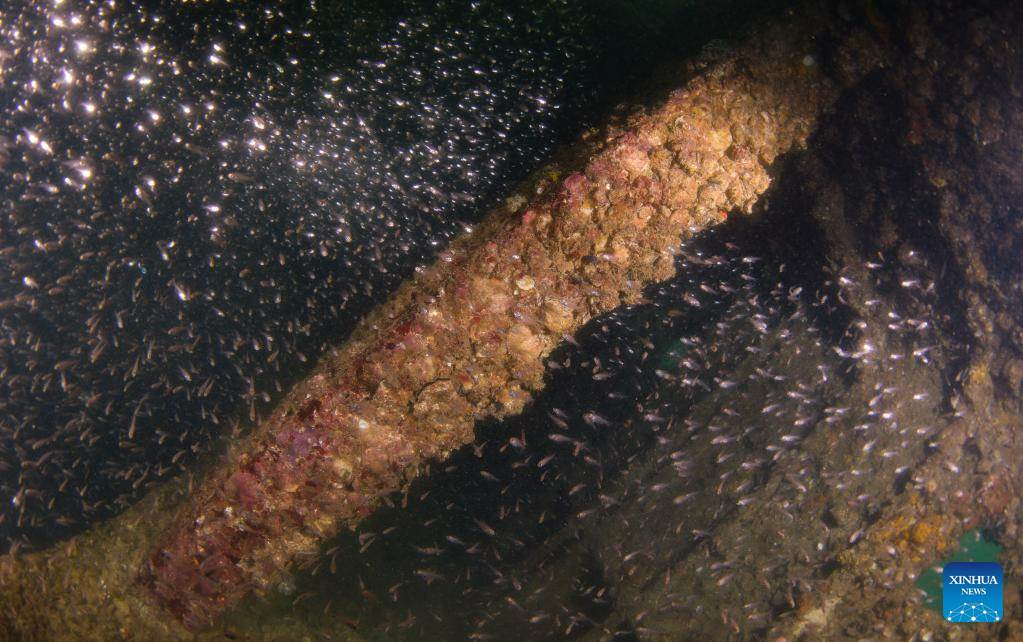| Foto yang diambil pada 16 Mei 2023 ini menunjukkan kawanan ikan di sebuah ladang ternak marin di perairan Pulau Wuzhizhou di Sanya, provinsi Hainan, selatan China. (Xinhua/Yang Guanyu) |