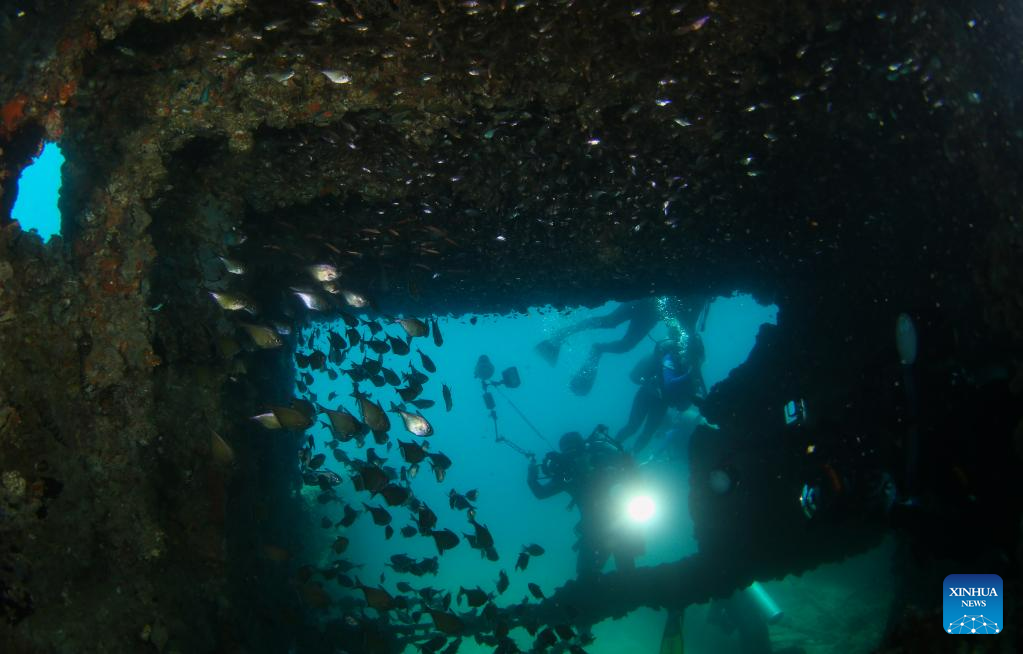 | Peminat fotografi mengambil gambar ikan di sebuah ladang ternak marin di perairan Pulau Wuzhizhou di Sanya, provinsi Hainan, selatan China pada 21 Mei 2021. (Xinhua/Yang Guanyu) |