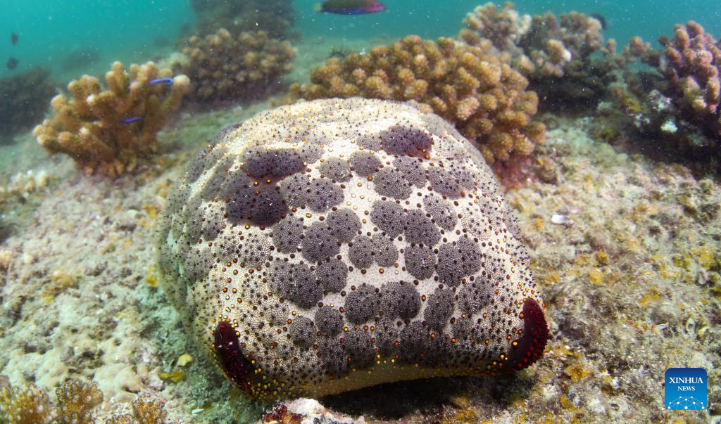 | Foto yang diambil pada 16 Mei 2023 ini menunjukkan tapak sulaiman “cushion star” di sebuah ladang ternak marin di perairan Pulau Wuzhizhou di Sanya, provinsi Hainan, selatan China. (Xinhua/ Yang Guanyu) |