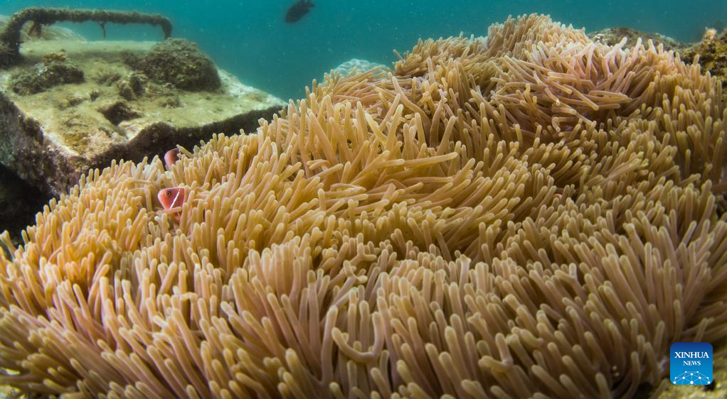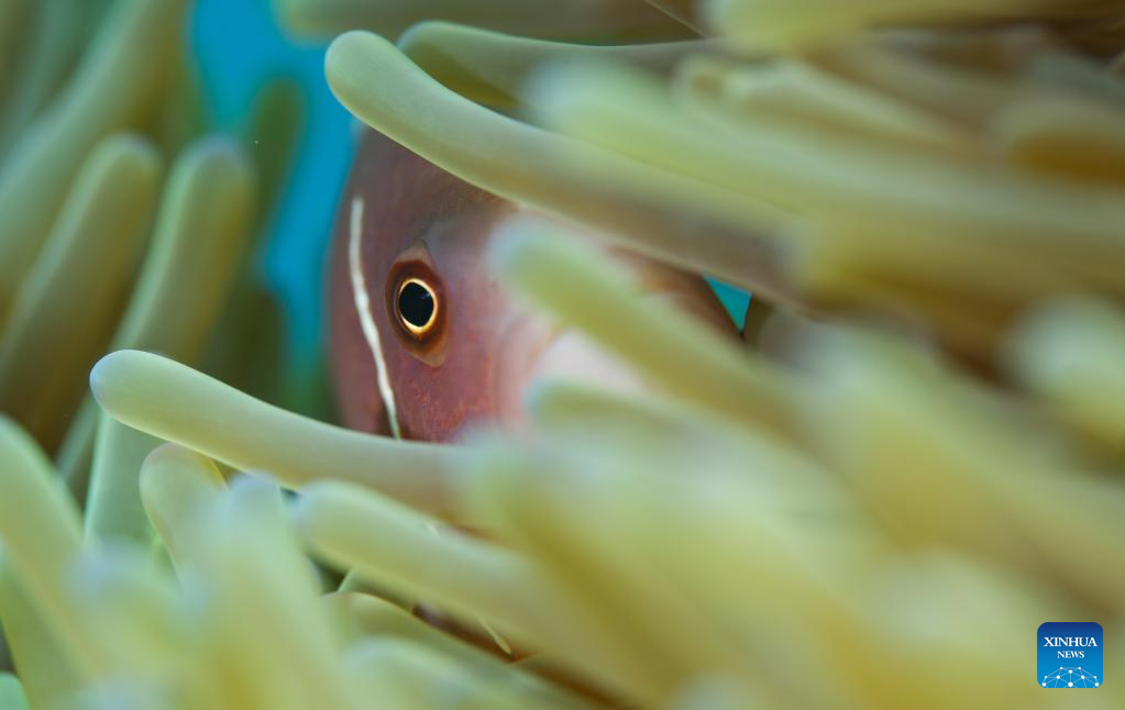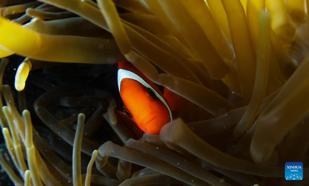 | Foto yang diambil pada 23 Mei 2021 ini menunjukkan seekor ikan badut di celah-celah buran laut di sebuah ladang ternak marin di perairan Pulau Wuzhizhou di Sanya, provinsi Hainan, selatan China. (Xinhua/ Yang Guanyu) |