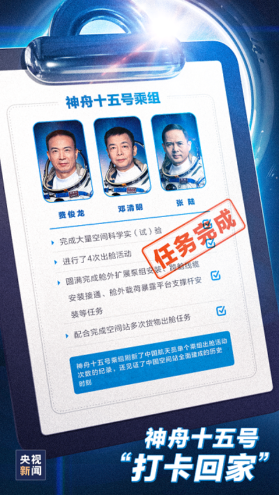 Kapsul kepulangan kapal Shenzhou-15 yang membawa tiga angkasawan Fei Junlong, Deng Qingming dan Zhang Lu selamat mendarat di tapak pendaratan Dongfeng di utara China pada pukul 6.33 pagi tadi waktu Beijing. Ketiga-tiga angkasawan dalam keadaan sihat.