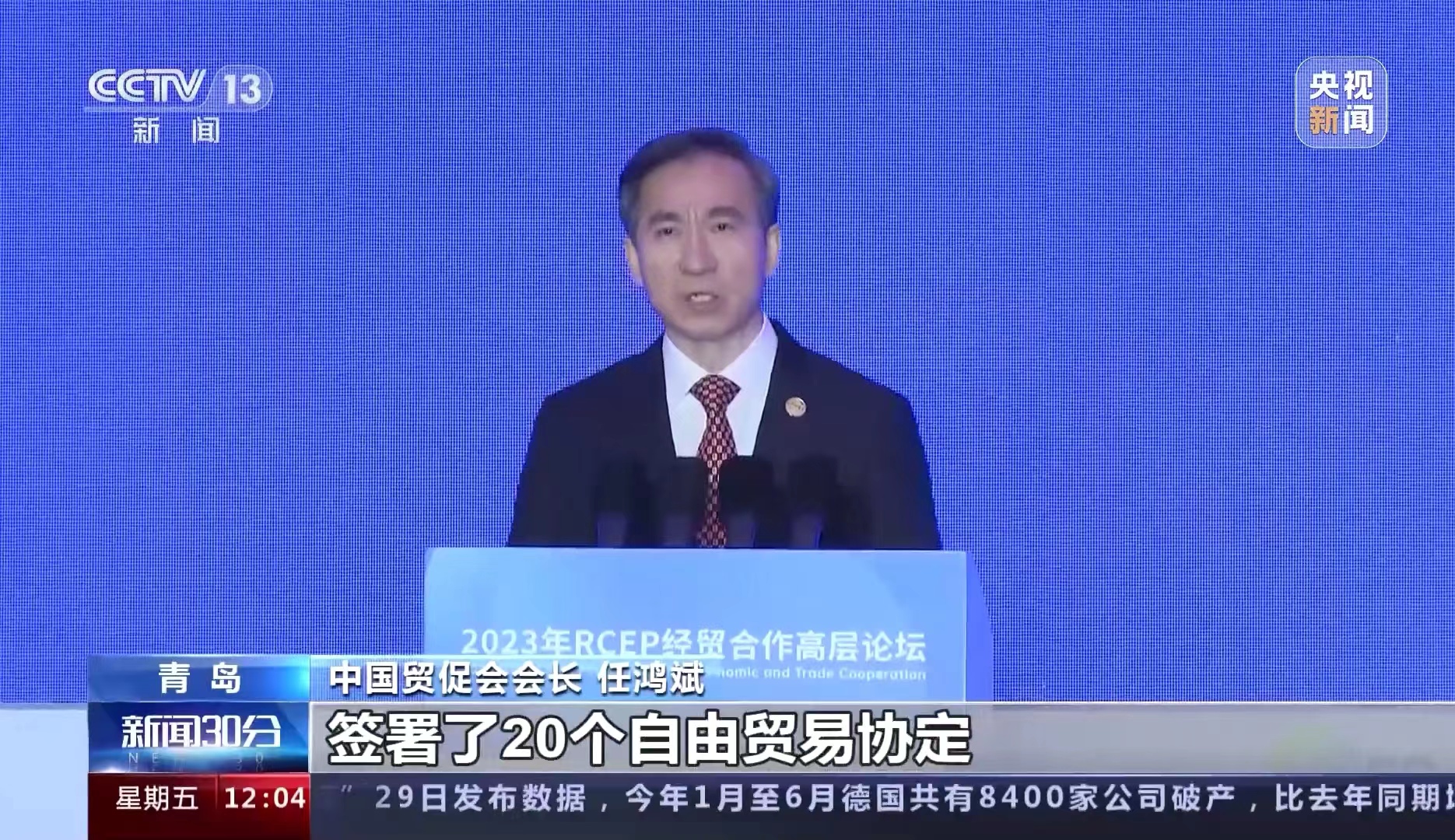 Pengerusi Majlis China untuk Penggalakan Perdagangan Antarabangsa (CCPIT), Ren Hongbin menyatakan bahawa China telah menandatangani 20 perjanjian perdagangan bebas dengan 27 negara dan wilayah, dan jumlah perdagangan dengan rakan dagang negara terbabit menyumbang kira-kira 35 peratus daripada jumlah perdagangan luar di China.
