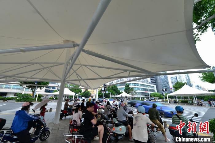| Foto yang diambil pada 7 Ogos ini menunjukkan penduduk bandar Fuzhou menunggu lampu isyarat di bawah khemah gergasi. (foto: Zhang Bin/Chinanews.cn) |