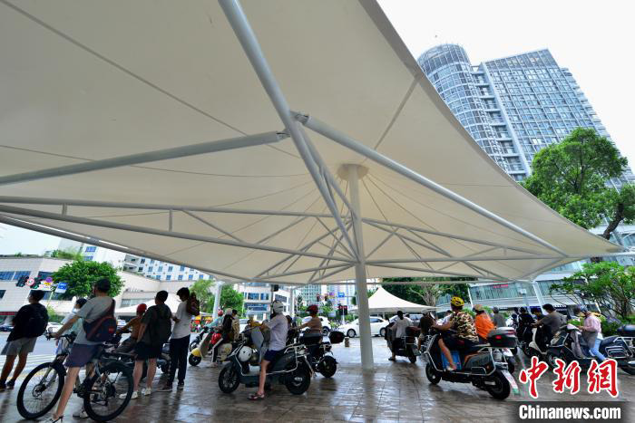 | Foto yang diambil pada 7 Ogos ini menunjukkan penduduk bandar Fuzhou menunggu lampu isyarat di bawah khemah gergasi. (foto: Zhang Bin/Chinanews.cn) |