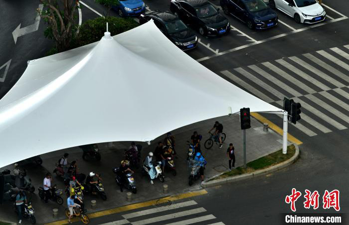 Baru-baru ini, empat khemah gergasi dibina di persimpangan Jalan Wusi dan Jalan Hualin di bandar Fuzhou untuk melindungi penduduk yang menunggu lampu isyarat daripada hujan dan matahari.
