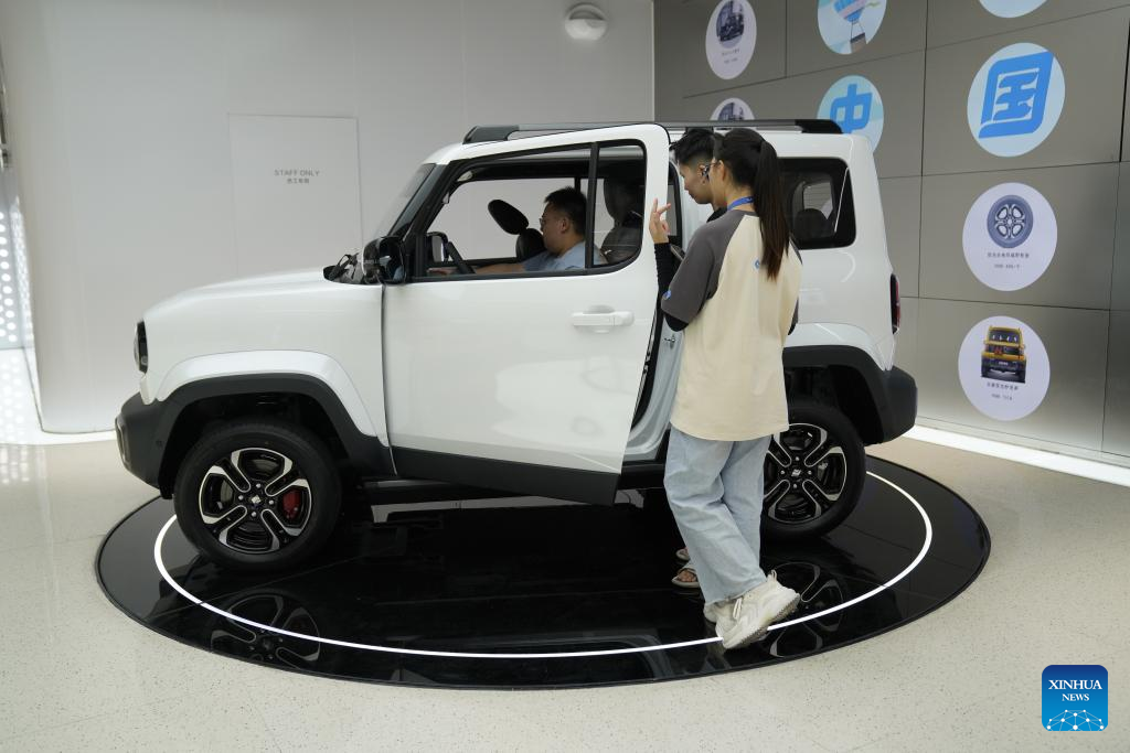 | Orang ramai diperkenalkan tentang kenderaan tenaga baharu (NEV) di kedai jualan di bandar Liuzhou, Wilayah Autonomi Zhuang Guangxi di selatan China, 5 Julai 2023. Orang yang melawat ke Liuzhou mungkin kagum dengan warna-warni kenderaan tenaga baharu (NEV) bersaiz kecil di bandar perindustrian ini yang diberi gelaran manja, "baobao bashi" atau "bas bayi" oleh penduduk tempatan. (Xinhua/Guo Yifan) |
