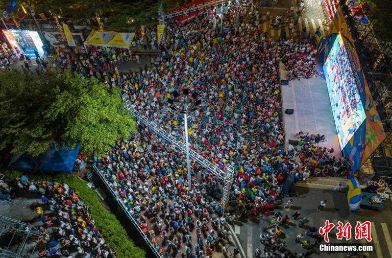 Skrin besar dipasang untuk peminat yang tidak dapat masuk ke gelanggang kerana terlalu sesak di luar venue perlawanan CunVA. (foto: Luo Yunfei/Chinanews.cn)