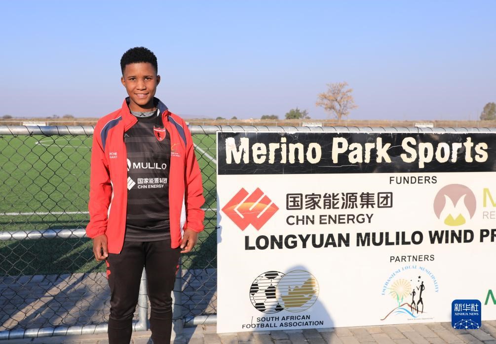 | Gambar diambil pada 10 Ogos menunjukkan seorang murid sekolah menengah diwawancara di tepi padang bola sepak yang diubah suai dengan bantuan Longyuan South Africa Renewables. (Foto/Xinhua) |