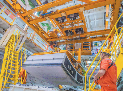 Di dalam mesin pengorek terowong perisai "Jinghua", pengendali memindahkan segmen terowong. (People's Daily/Liu Fuchang)