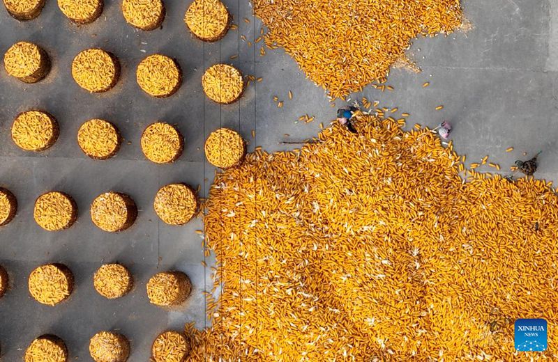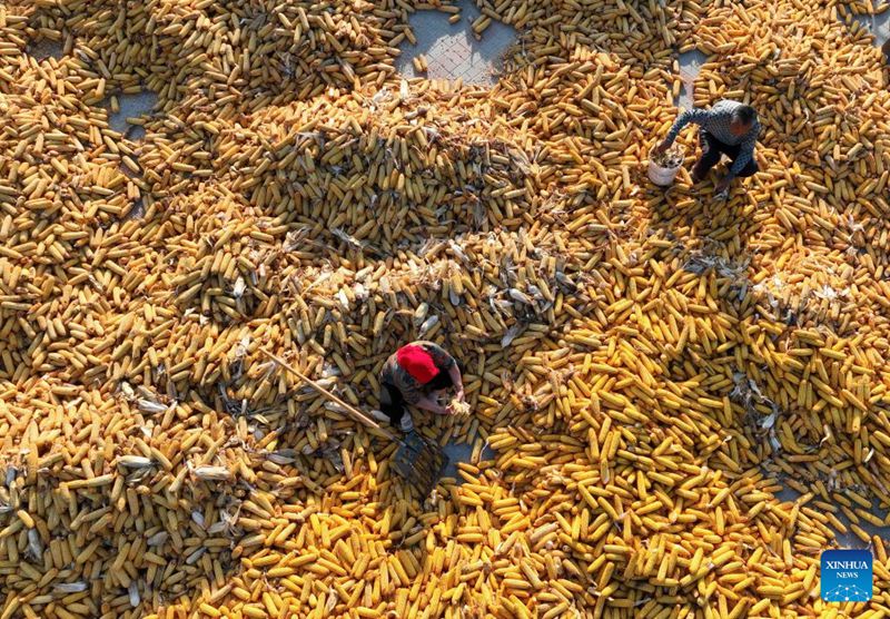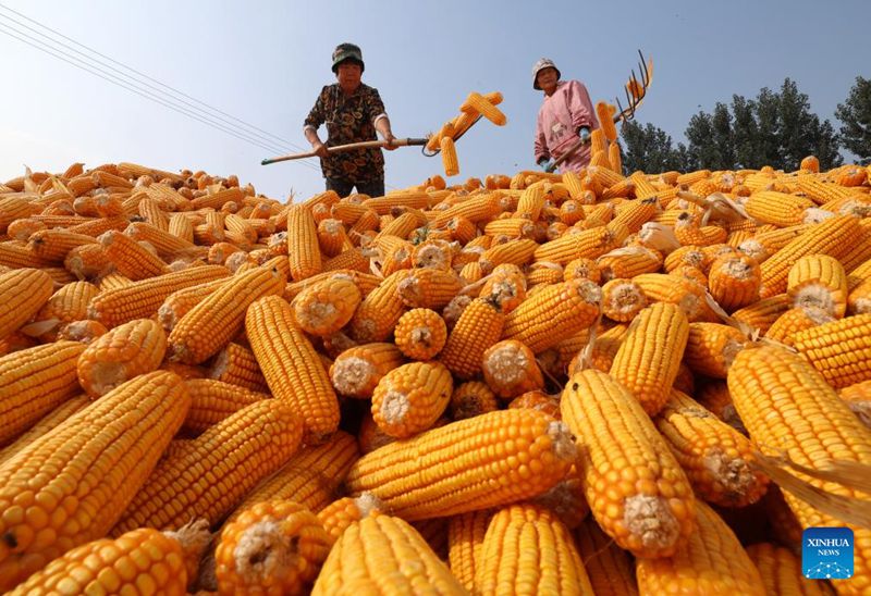 | Petani mengeringkan jagung di Zhoujiazhuang, bandar Jinzhou, provinsi Hebei, utara China, 8 Oktober 2023. (Foto oleh Zhang Xiaofeng/Xinhua) |