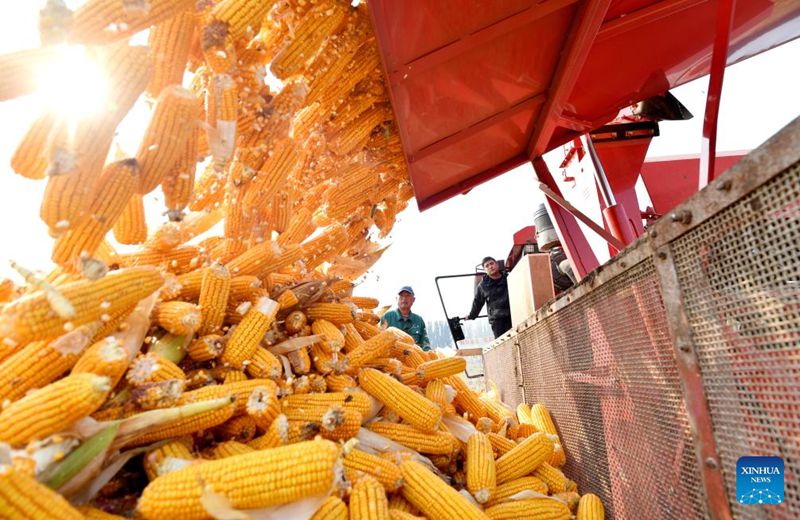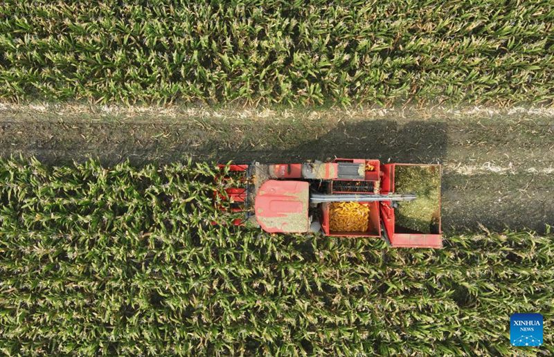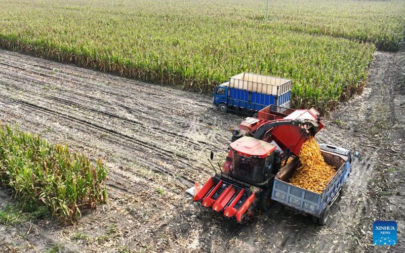 | Petani menuai jagung di kampung Zhoujiazhuang, bandar Jinzhou, provinsi Hebei, utara China, 8 Oktober 2023. (Foto oleh Zhang Xiaofeng/Xinhua) |