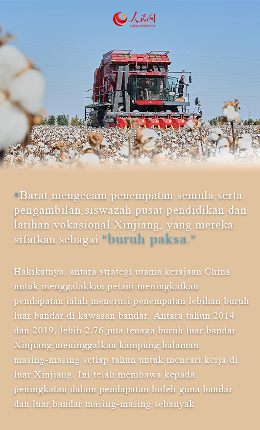 Hakikatnya, antara strategi utama kerajaan China untuk menggalakkan petani meningkatkan pendapatan ialah menerusi penempatan lebihan buruh luar bandar di kawasan bandar. Antara tahun 2014 dan 2019, lebih 2.76 juta tenaga buruh luar bandar Xinjiang meninggalkan kampung halaman masing-masing setiap tahun untuk mencari kerja di luar Xinjiang. Ini telah membawa kepada peningkatan dalam pendapatan boleh guna bandar dan luar bandar masing-masing sebanyak RMB34,700 dan RMB13,100.