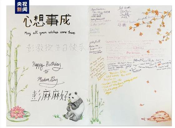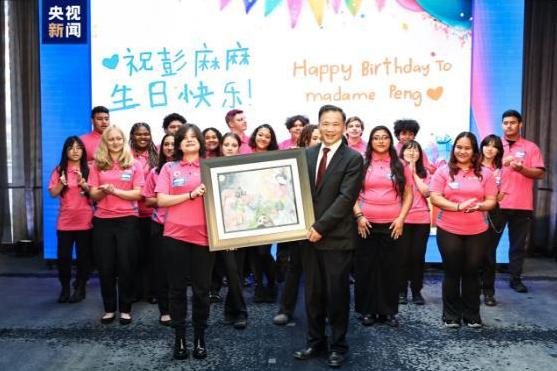Pelajar dari kumpulan koir Tacoma's Lincoln High School, Washington, Amerika Syarikat (AS) memberikan karya lukisan yang dihasilkan mereka sendiri kepada Presiden Xi Jinping dan isterinya Peng Liyuan, sambil mengucapkan Selamat Hari Jadi kepada Peng Liyuan, menyerahkan kad hari jadi dan menyanyikan lagu korus.