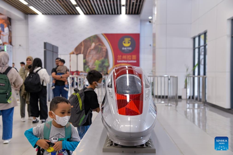 | Dua kanak-kanak lelaki melihat model kereta api pelbagai unit elektrik (EMU) berkelajuan tinggi kereta api laju Jakarta-Bandung di Stesen Halim di Jakarta, Indonesia, 17 Disember 2023. (Xinhua/Xu Qin) |