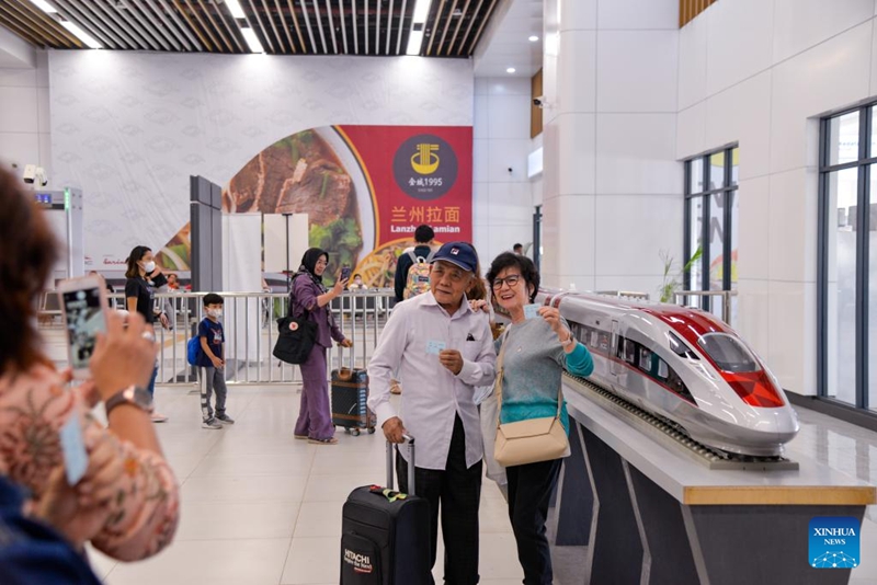 | Penumpang bergambar dengan model kereta api pelbagai unit elektrik (EMU) berkelajuan tinggi kereta api laju Jakarta-Bandung di Stesen Halim di Jakarta, Indonesia, 17 Disember 2023. (Xinhua/Xu Qin) |