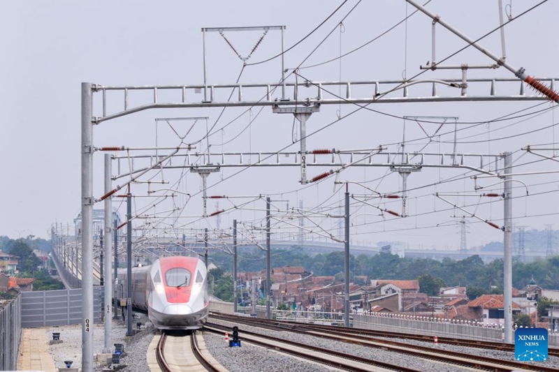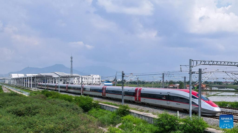 | Sebuah kereta api pelbagai unit elektrik (EMU) berkelajuan tinggi hampir tiba di Stesen Padalarang Indonesia, 12 Disember 2023. (Xinhua/Xu Qin) |