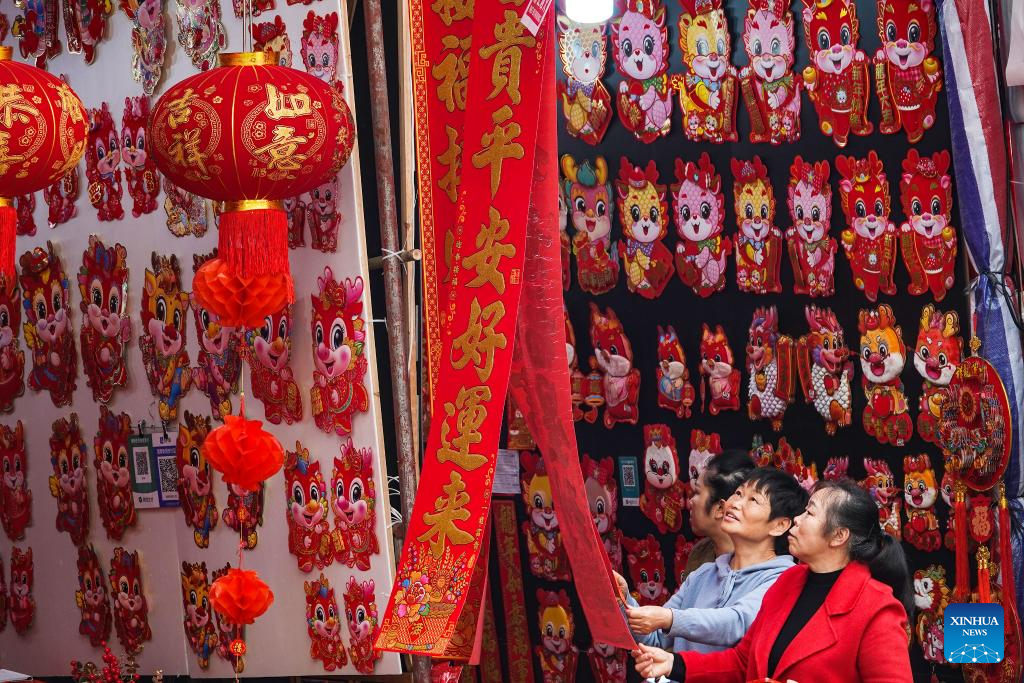| Penduduk membeli duilian (lemparan puisi tahun baharu) di sebuah pasar di Nanning, Wilayah Autonomi Zhuang Guangxi, selatan China, 14 Januari 2024. (Xinhua/Yu Xiangquan) |