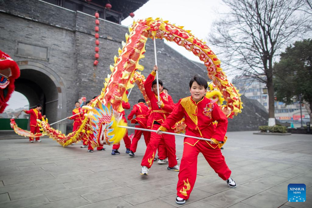 | Pelajar berlatih tarian naga di Xinhua, provinsi Jiangsu, timur China, 14 Januari 2024. (Xinhua/Zhou Shegen) |
