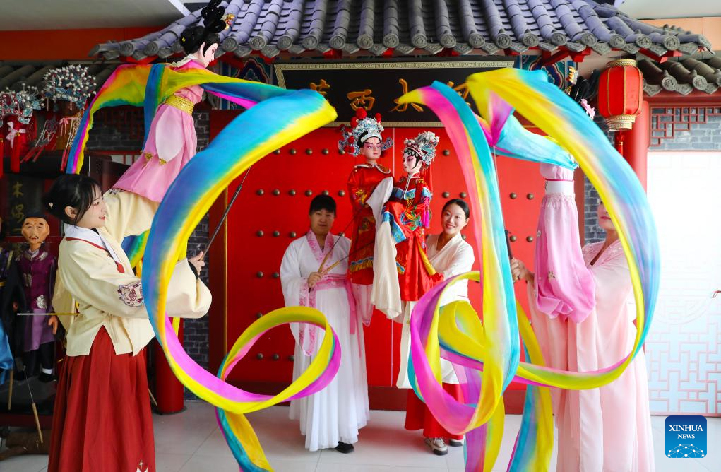 | Anggota rombongan wayang boneka berlatih di Laixi, provinsi Shandong, timur China, 14 Januari 2024. (Xinhua/Zhang Jingang) |