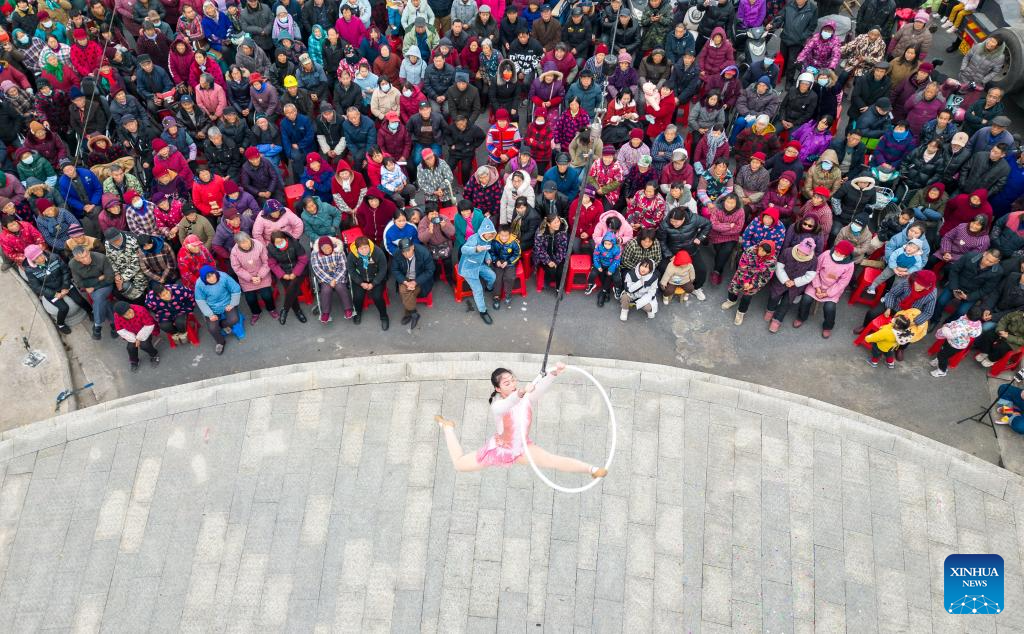 | Foto udara yang diambil pada 14 Januari 2024 ini menunjukkan seorang akrobat membuat persembahan di pekan Yazhou, Haian, provinsi Jiangsu, timur China. (Xinhua/Zhai Huiyong) |