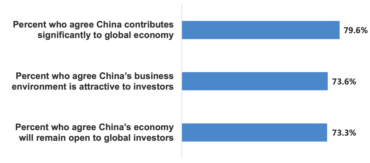 Dalam tinjauan itu, 79.6% responden sangat teruja terhadap sumbangan diberikan ekonomi China terhadap pertumbuhan ekonomi dunia, manakala 73.6% responden pula berpendapat bahawa persekitaran perniagaan di China merupakan tarikan besar bagi pelabur global. Selain itu, 73.3% responden yakin bahawa China konsisten dalam peningkatan tahap keterbukaan pada masa hadapan dan boleh terus membawa peluang kepada dunia.