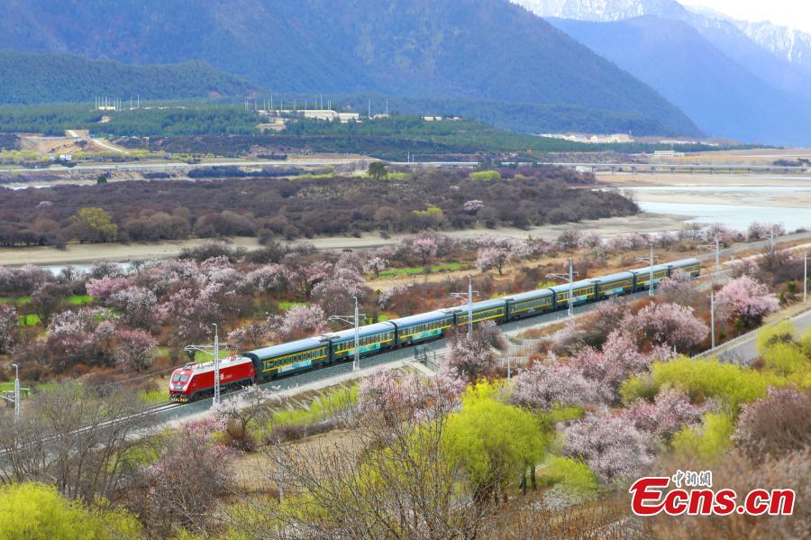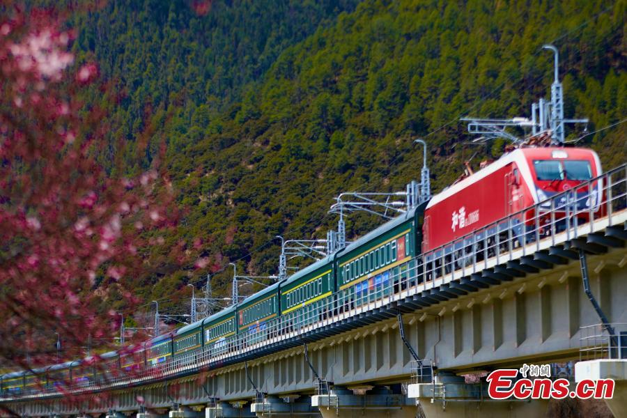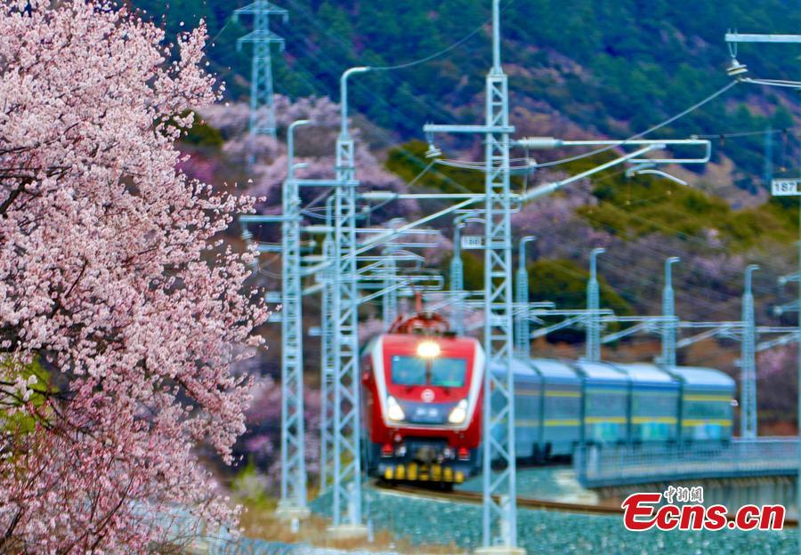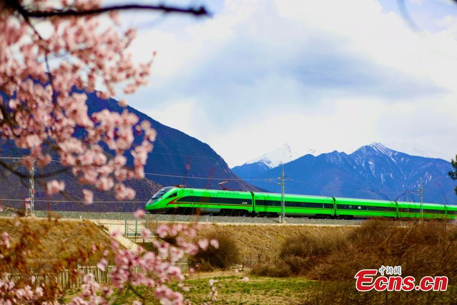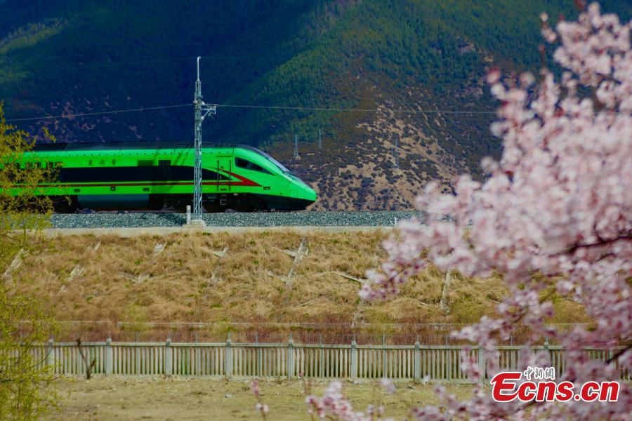 | Kereta api laju Fuxing melintasi bunga-bunga pic ketika melalui laluan Lhasa-Nyingchi di Wilayah Autonomi Xizang, barat daya China pada 7 April, 2024. (Foto: China News Service/Ma Shengming) |