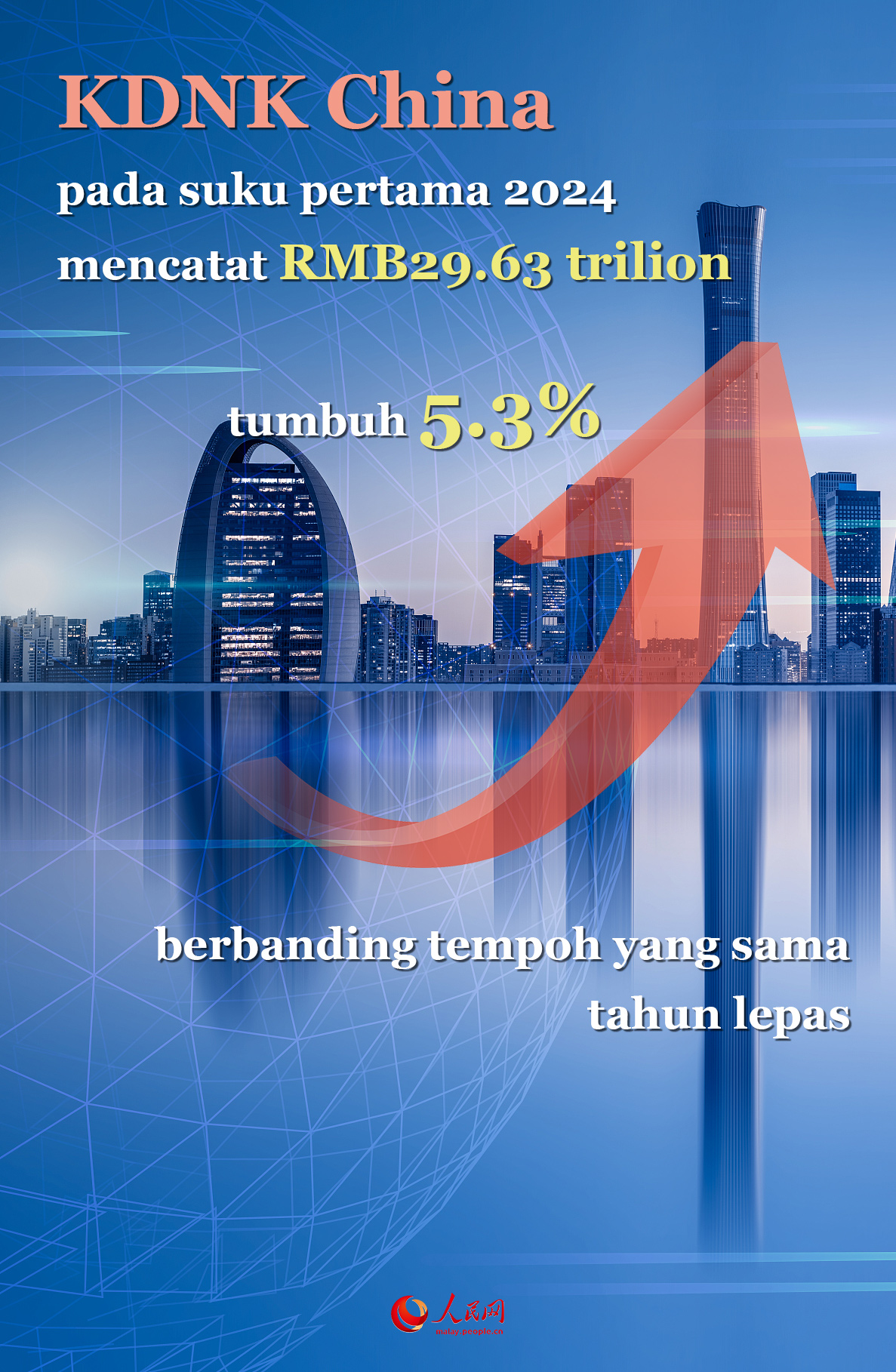 Menurut Naib Pesuruhanjaya Biro Statistik Negara (NBS), Sheng Laiyun, Keluaran Dalam Negara Kasar (KDNK) China pada suku pertama 2024 mencatat RMB29.63 trilion (RM19.63 trilion), bertumbuh 5.3 peratus berbanding tempoh yang sama tahun lepas, dan bertambah 1.6 peratus berbanding suku tahun keempat 2023.